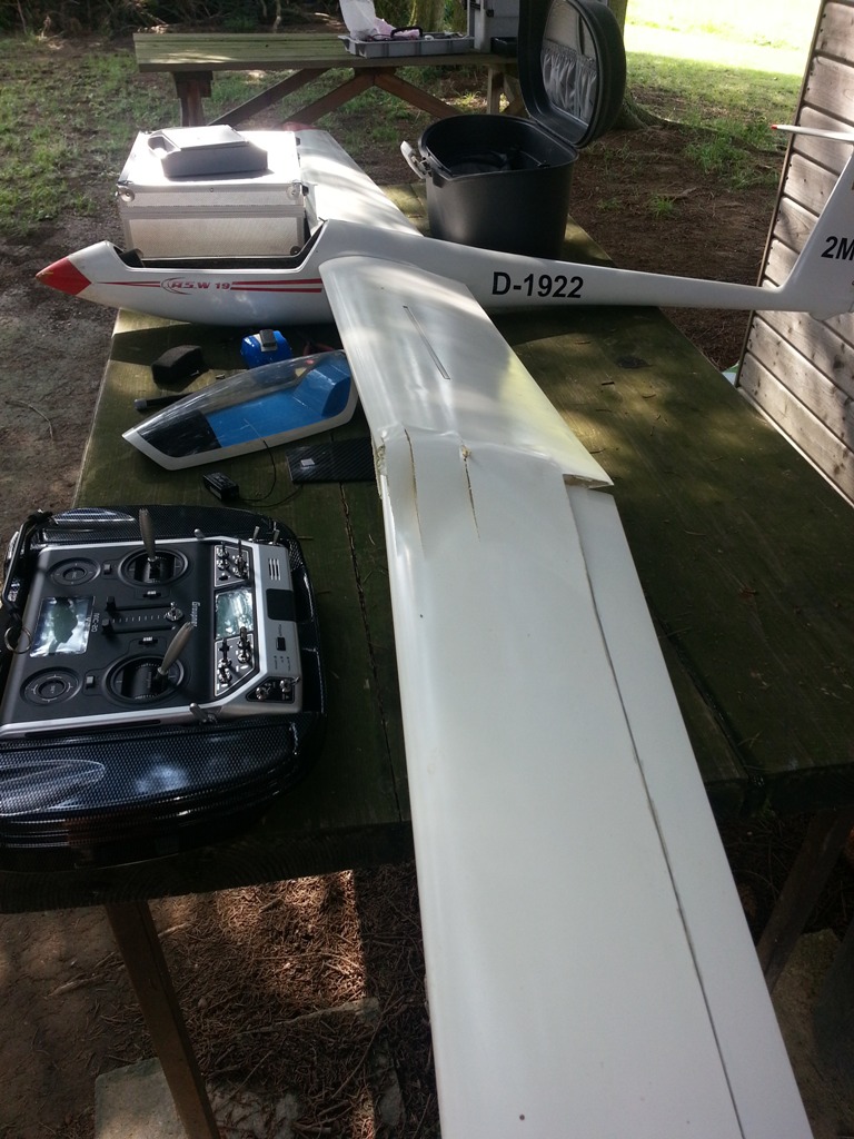 Leider hatte ich im Spätsommer 2016 einen Akkuausfall und konnte die ASW 19 nur unter Mühe in Platznähe bringen, bis sie in etwa 20 m Höhe mit einer Fläche einen Baum gestreift hat und unsanft die Wiese küsste.