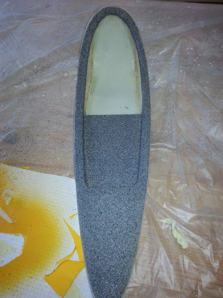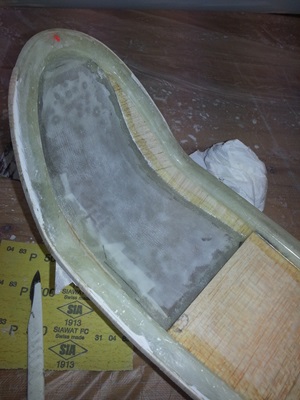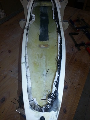 Der Wiederaufbau gestaltete sich dann doch schwieriger als gedacht. Da die Reparaturversuche des Vorbesitzers als gescheitert betrachtet werden konnten, musste der Rumpf zuerst von überflüssigen Harzresten befreit werden.