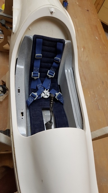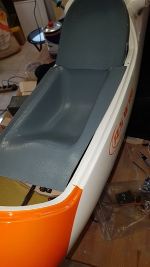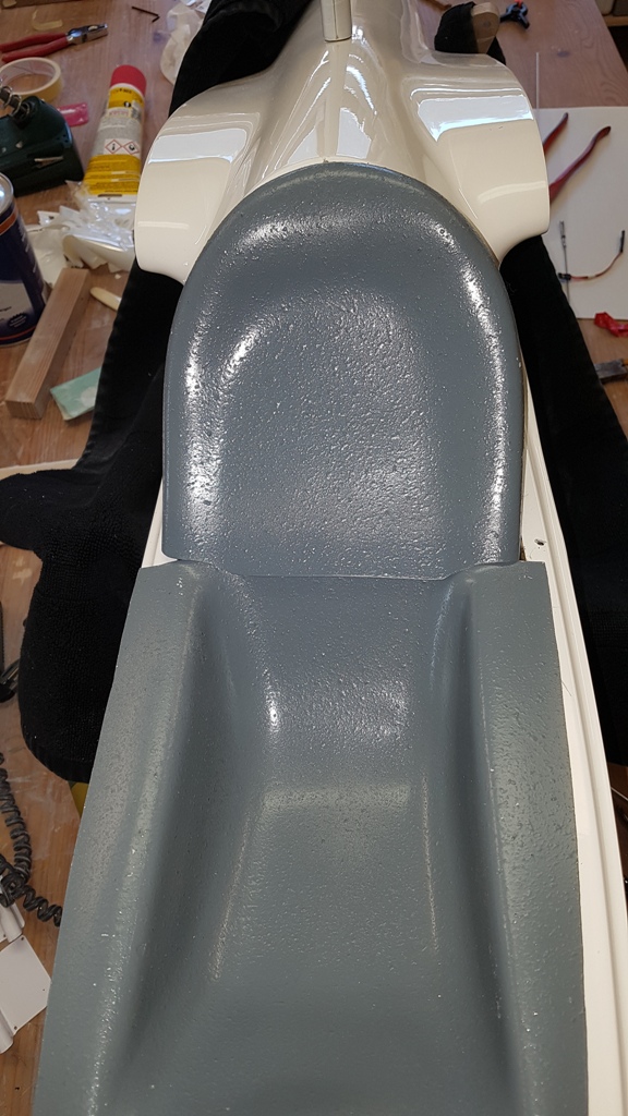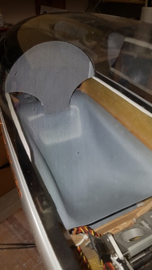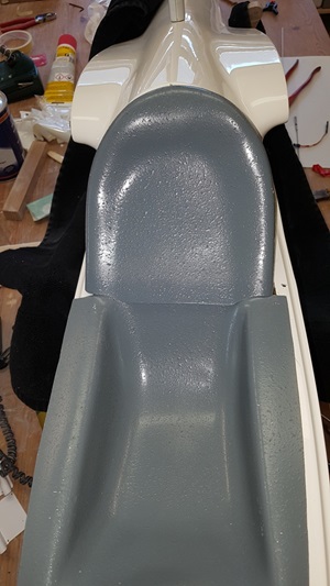 Die hintere Sitzschale der DG wurde kurzerhand zugesägt und angepasst. Danach noch Auflagen für die Sitzwanne im Rumpf verklebt und so positioniert, dass der Haubenrahmen mit dem Panel passt. Leider findet kein Pilot Platz, da das Servobrett zu hoch im Rumpf eingebaut ist und deshalb die Sitzschale entsprechend abgeändert werden musste.