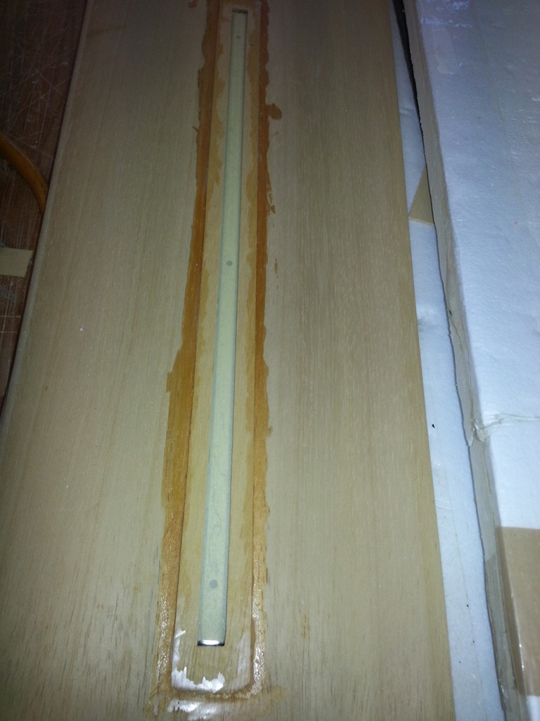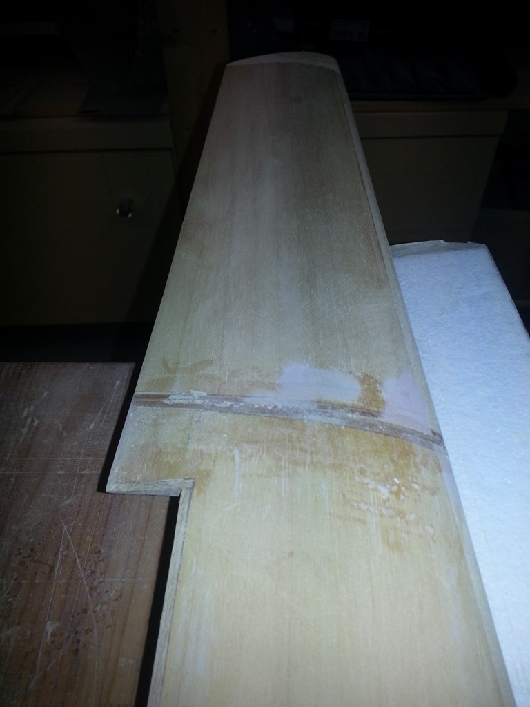 Nachdem die Folie der Tragflächen entfernt wurde, konnte man sehen dass die Ansteckflügel nur sehr einfach an der Hauptfläche angeklebt wurden. Sie hatten zur Fläche hin zu wenig Stabilität und führten ein dementsprechendes Eigenleben. Die Ansteckflächen wurden abgetrennt und mit einer stabileren Steckung versehen. Im Anschluss wurde die Linie der QR auf diese übertragen, so dass das Ganze wieder ein richtiges Bild gab.
