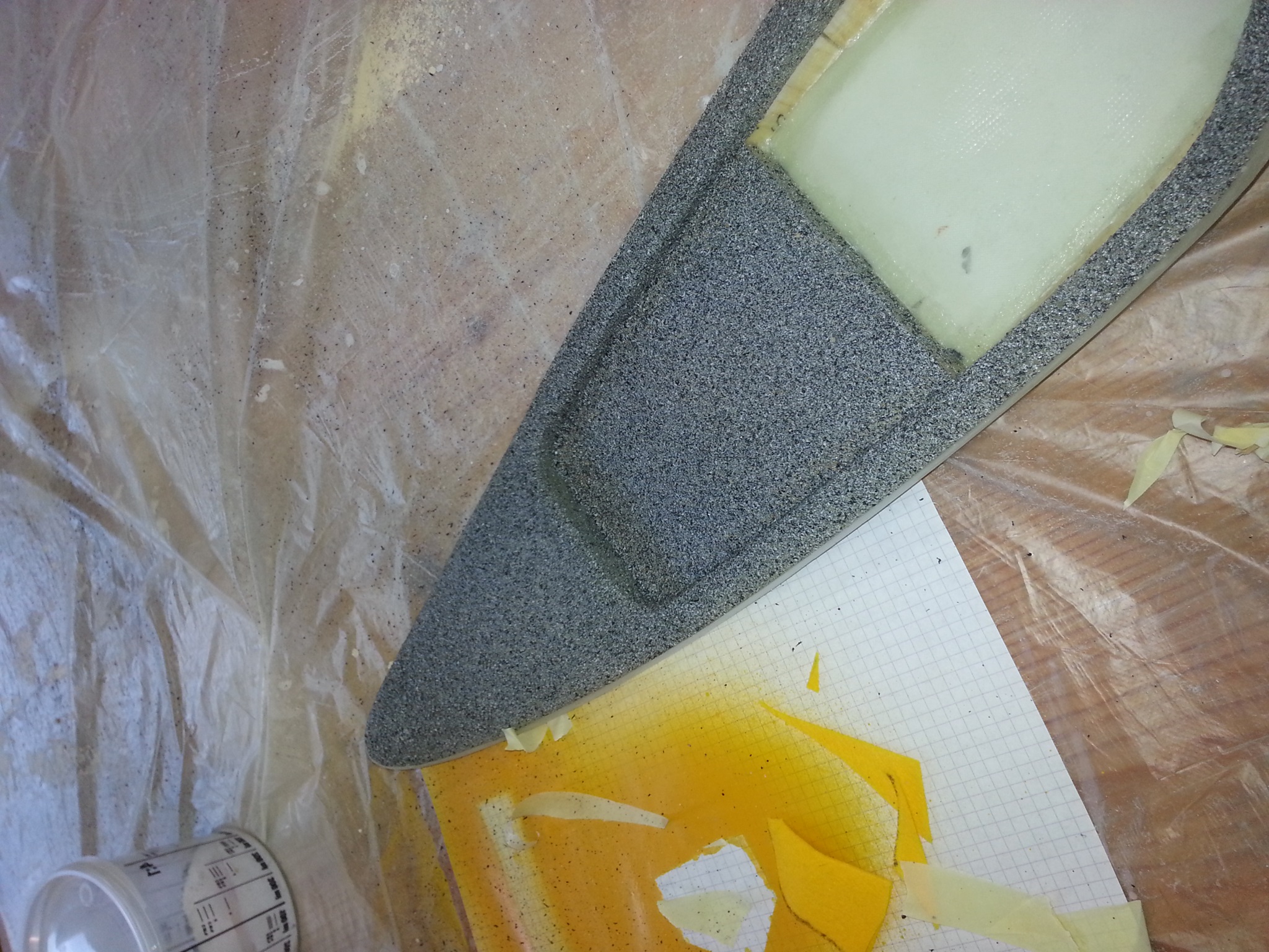 Der Wiederaufbau gestaltete sich dann doch schwieriger als gedacht. Da die Reparaturversuche des Vorbesitzers als gescheitert betrachtet werden konnten, musste der Rumpf zuerst von überflüssigen Harzresten befreit werden.