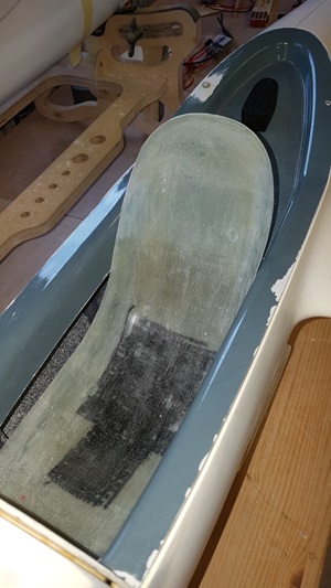 Die hintere Sitzschale der DG wurde kurzerhand zugesägt und angepasst. Danach noch Auflagen für die Sitzwanne im Rumpf verklebt und so positioniert, dass der Haubenrahmen mit dem Panel passt. Leider findet kein Pilot Platz, da das Servobrett zu hoch im Rumpf eingebaut ist und deshalb die Sitzschale entsprechend abgeändert werden musste.